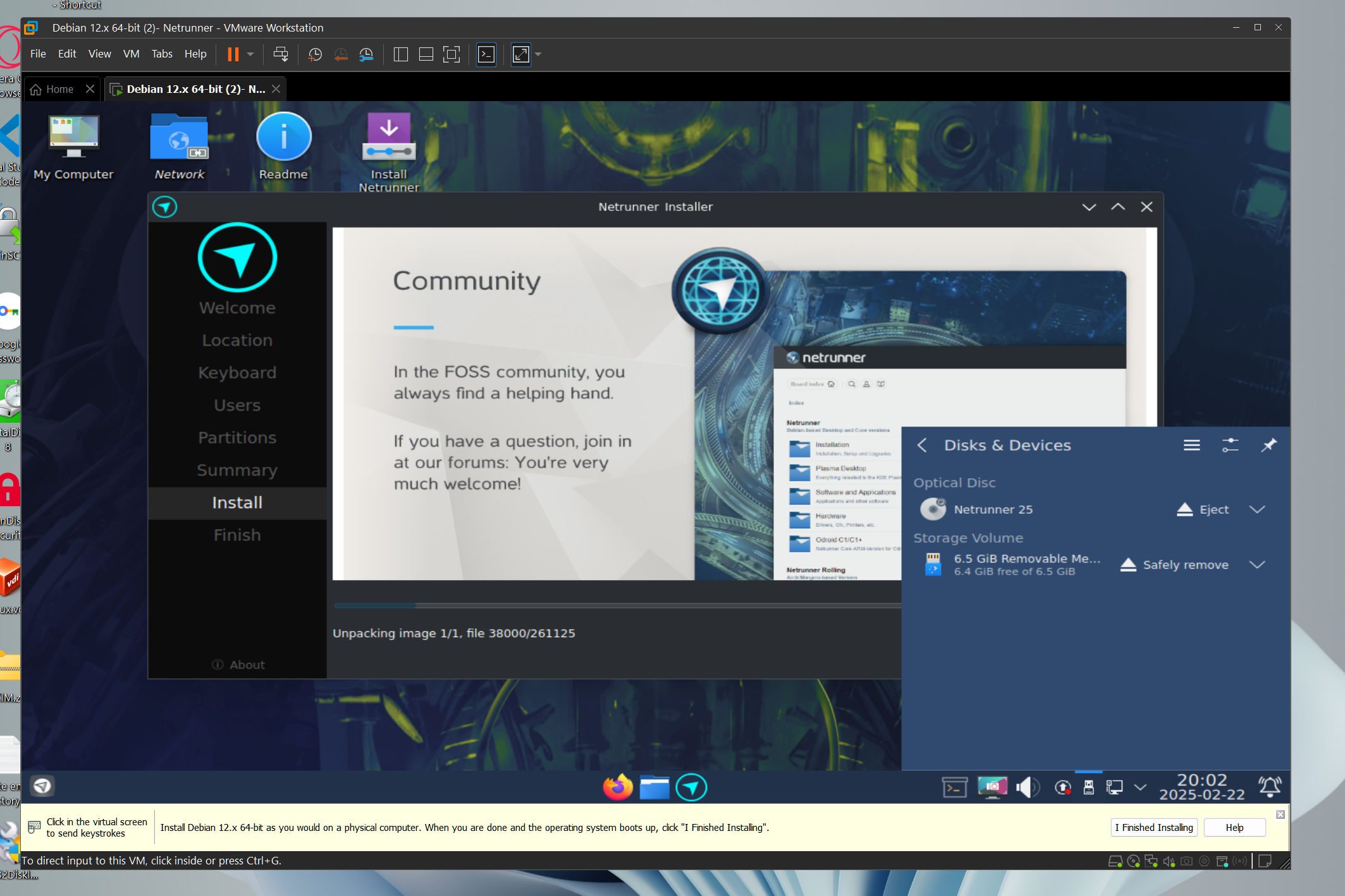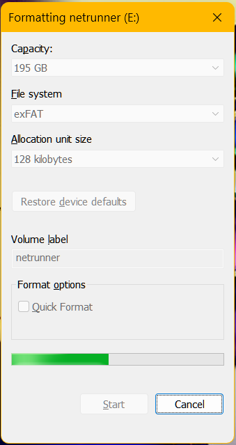 So far I am formatting the disk E:\ as "netrunner" isolated from an entire 1 TB Sandisk Extreme SSD (USB 3.0), hosted on my Windows 11 Home machine.