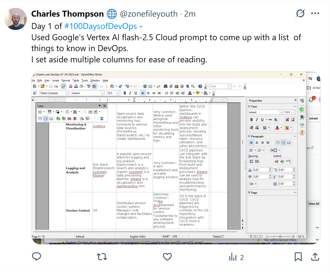Ends by November 6th. I have begun my landscape and interviewing atmosphere for the many stages of DevOps as I'm learning along here. Living in the Silicon Valley with DNS ccTLD experience has me at a good position to take a job doing this. So far I've used Google's Vertex AI (a compass) to generate a table list of all the facets and the important things. The key is learning the architecture of DevOps to be in a working perception involving all the duty & detail of the trade. Practicing many scenarios of use will benefit me greatly.